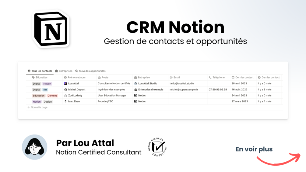 Centralisez et gérez efficacement tous vos contacts et opportunités grâce à ce modèle Notion complet et facile à utiliser, conçu pour les entrepreneurs et les professionnels de tous les secteurs. Optimisez votre vie professionnelle et votre prospection ! ➡️