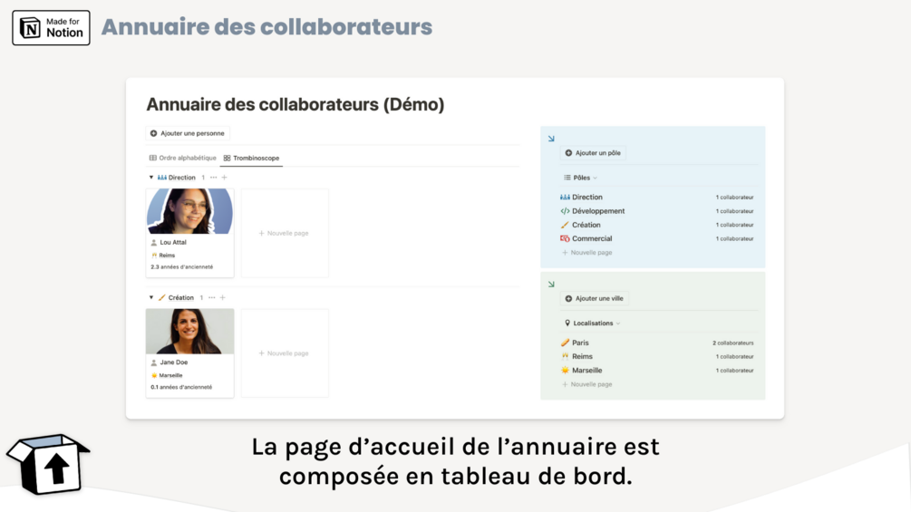 Ce modèle Notion d'annuaire des collaborateurs est conçu pour aider à suivre et organiser les informations sur les collaborateurs d'une entreprise ou d'une association 🙋