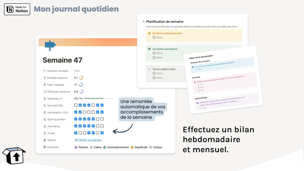Chaque semaine, chaque mois et chaque année, des pages de bilan spécifiques sont prévues. Ces pages vous encouragent à réfléchir de manière introspective à vos intentions, vos objectifs, et comment vous avez progressé vers leur réalisation.