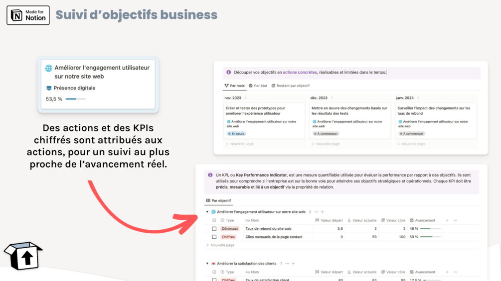 Il comprend des sections pour définir les objectifs, énumérer les actions nécessaires pour les atteindre, suivre l'évolution des KPIs, et visualiser l'ensemble des objectifs sur un tableau de bord.