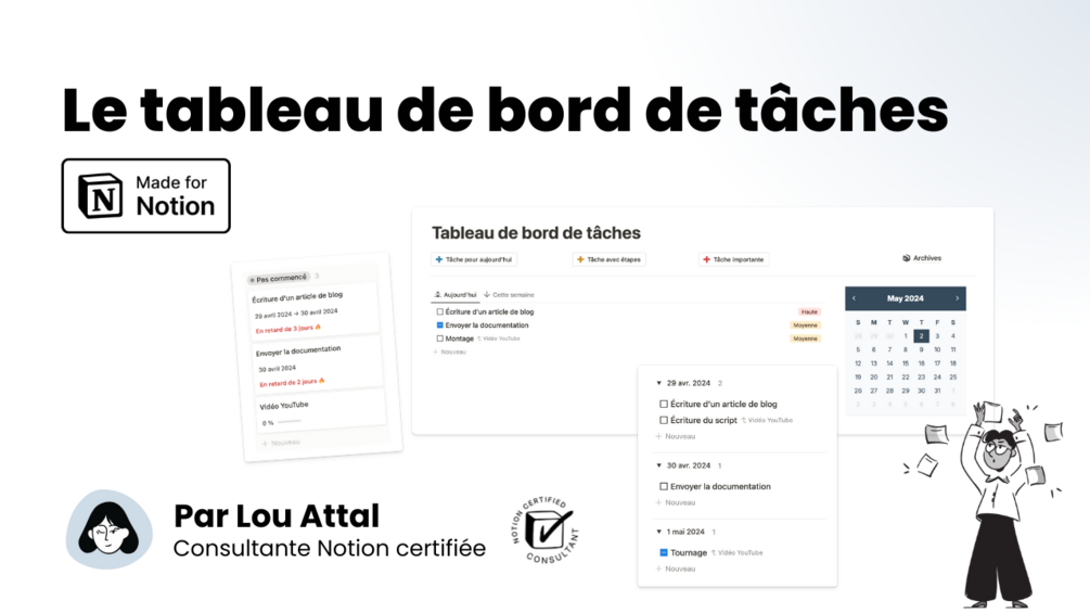 Un tableau de bord optimisé dans Notion pour toute votre gestion de tâches ! Vous y retrouverez plusieurs vues pour voir vos tâches de façon contextuelle, des boutons et formules pour faciliter votre navigation et votre organisation.